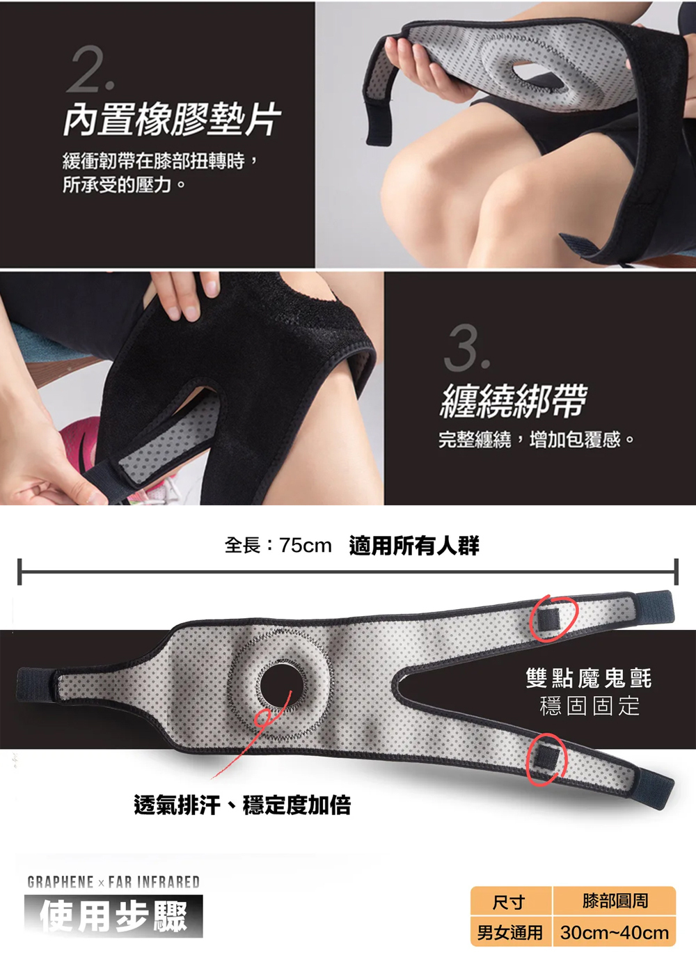 膝部圓周:30~40cm (男女通用)